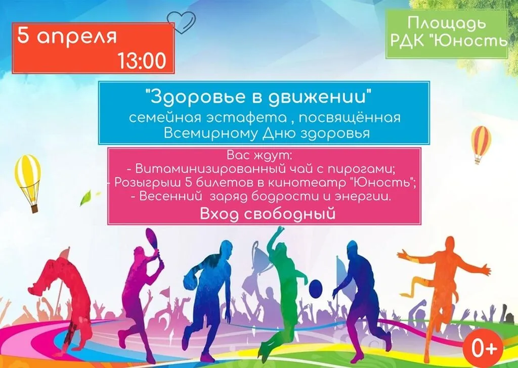 5 апреля 13.00 семейная эстафета, посвящённая Всемирному Дню здоровья "Здоровье в движении" (Площадь РДК "Юность")